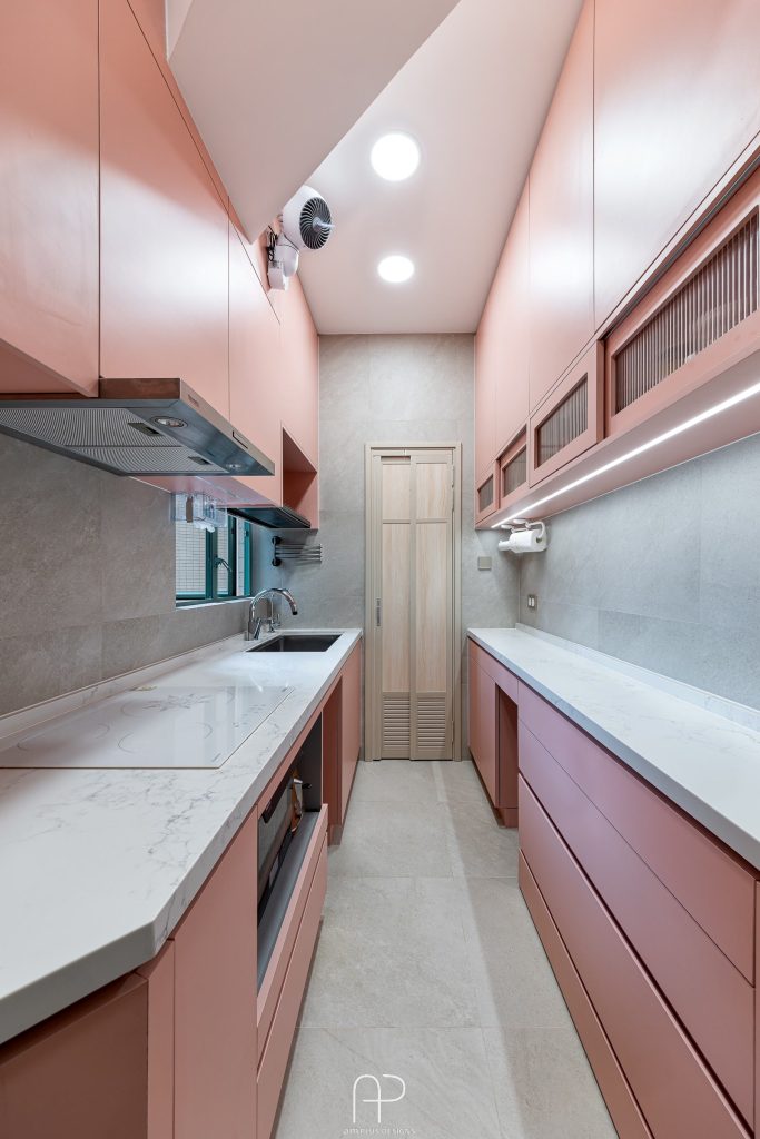 廚房設計別具趣味性,運用戶主鍾愛的粉紅色調,配搭潔白石材檯面,打造明亮愉悅的烹飪環境。充沛的自然採光更增添了空間的舒適感。